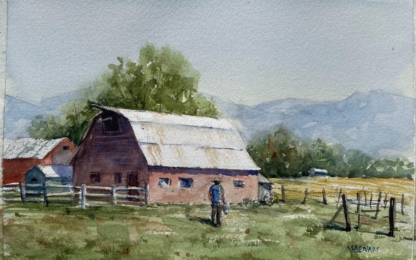 Grateful for the Never Ending Routine — a watercolor that presents a quiet moment on the farm. A lone figure crosses the pasture toward a sun-warmed barn, fences leading the eye toward distant blue mountains... trees tuck behind the roof, and the sky holds a cool, pale hush. I used layered transparent washes and restrained wet-into-wet passages to suggest depth, with careful brushwork and a bit of drybrush to bring texture to the roof and fence. The paper’s white becomes the highlight on the corrugated metal and the path underfoot.