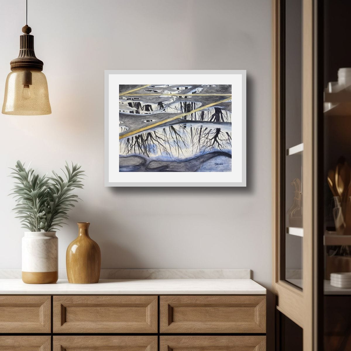This watercolor painting was inspired by the puddles found near my home. I’ve always been drawn to them after a rain — how something so ordinary can hold such unexpected beauty. The reflections in the water transform the gray pavement into a mirror of trees and sky, something that I find so beautiful. When I stand there after the rain one of the best parts is the smell that grounds me. This piece is my way of honoring those quiet, overlooked moments where nature reminds us to pause and see deeper. This painting is 18 x 16 inches. With a 3 inch mat, it fits perfectly into a 20 x 24 frame. Frame and mat not included.