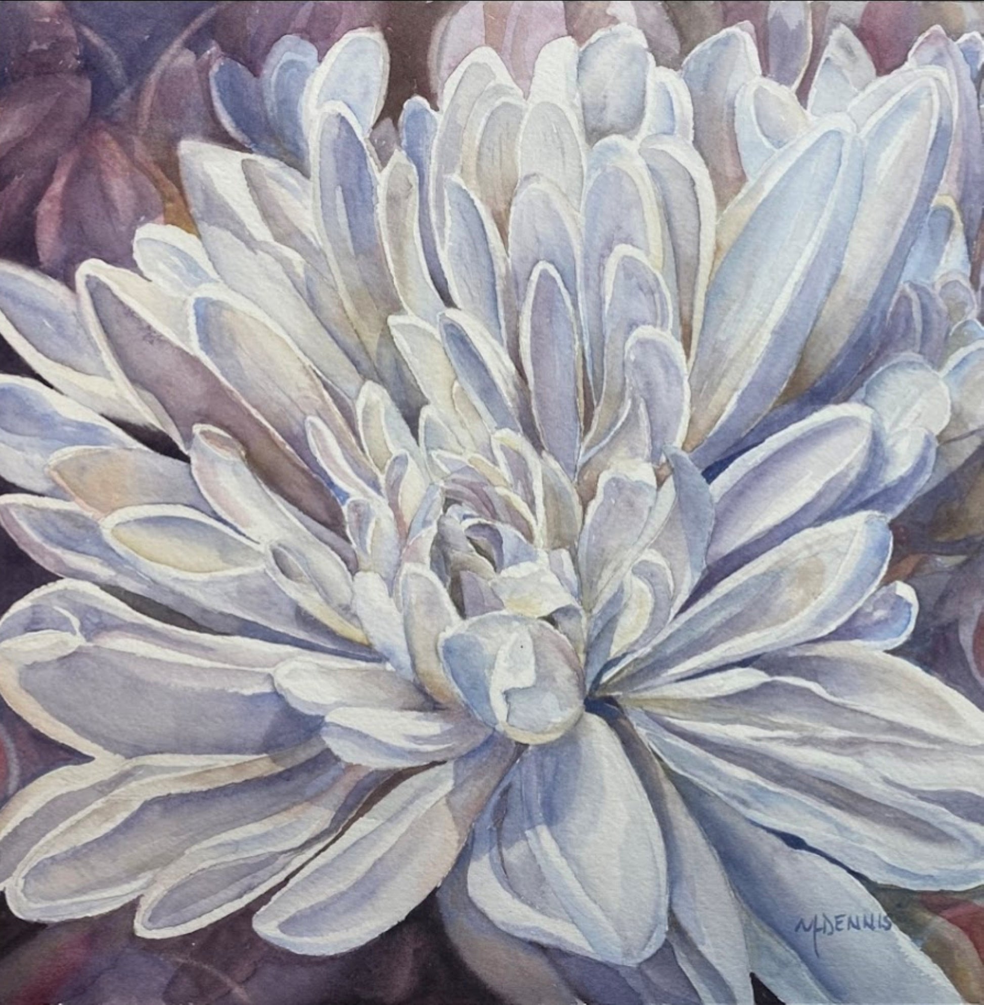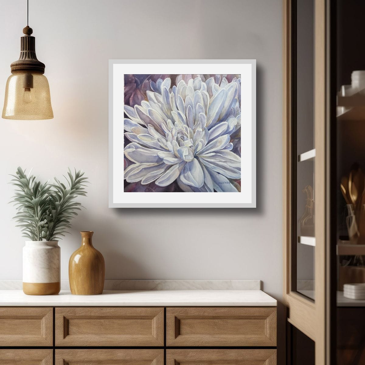 This watercolor painting captures the quiet beauty of a white chrysanthemum. A gift from my husband, just because. Each petal unfolds gently, almost like a whisper, drawing the eye into the heart of the bloom. I wanted to create a sense of stillness and elegance, letting the light dance across the petals in a way that feels both delicate and strong. The colors on the white petals are the real beauty of this flower. It’s a piece that speaks about beauty in simplicity, and the calming presence of nature.